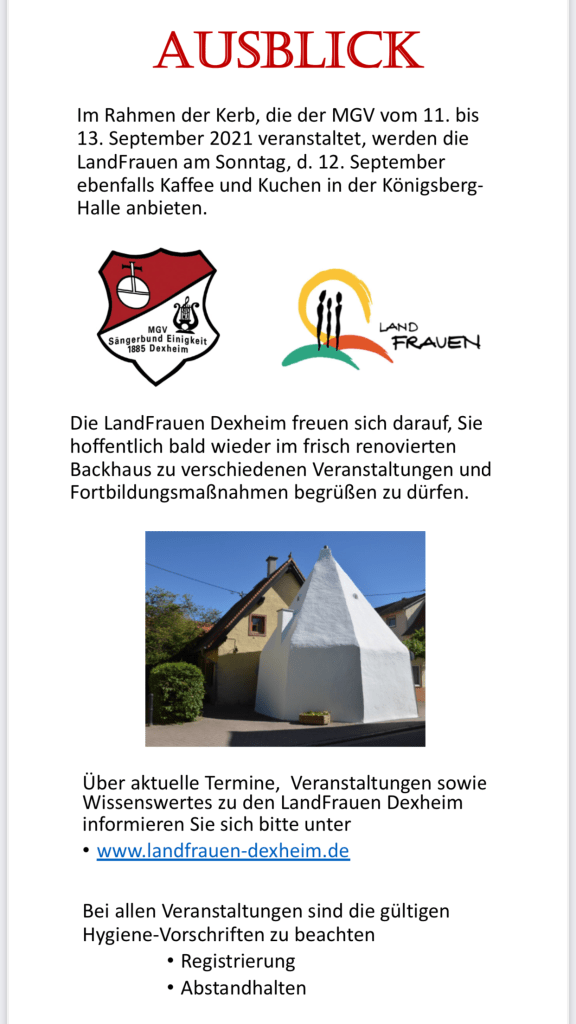 Am vergangenen Samstag richteten die Dexheimer LandFrauen zum ersten Mal in diesem Jahr wieder ihr Dorf-Café aus. Bei strahlendem Sonnenschein fanden sich viele Dexheimer, aber auch Bürger und Bürgerinnen umliegender Gemeinden, rund um das Rathaus und den schönen Rathaus-Garten ein. Dort konnten Sie entspannt bei einer Tasse Kaffee und leckerem Kuchen miteinander ins Gespräch zu kommen – zu lange schon musste dieses traditionelle Dorf-Café coronabedingt pausieren.