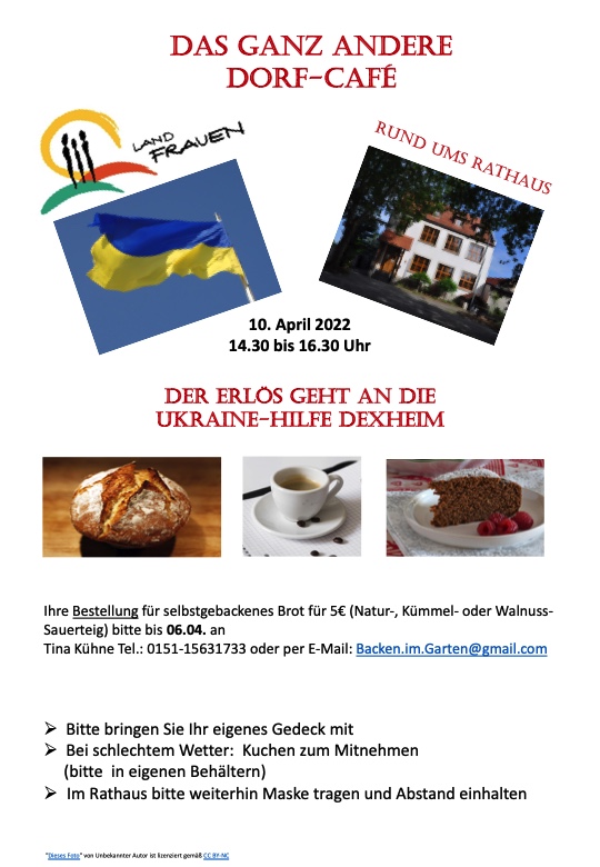 Anlässlich des Dorf-Cafés zur Dexheimer Kerb am 18. Juni 2023 entschieden sich die LandFrauen Dexheim, ihren Erlös für Tiere im Überschwemmungsgebiet der Ukraine zu spenden: es wurden 300 Euro an die Helfer der Oppenheimer Kleiderkammer übergeben. Von diesem Geld wurden Futterspenden gekauft, die dann direkt und unbürokratisch in die Ukraine weitertransportiert werden, um den notleidenden Tieren aus dem Überschwemmungsgebiet zu helfen.