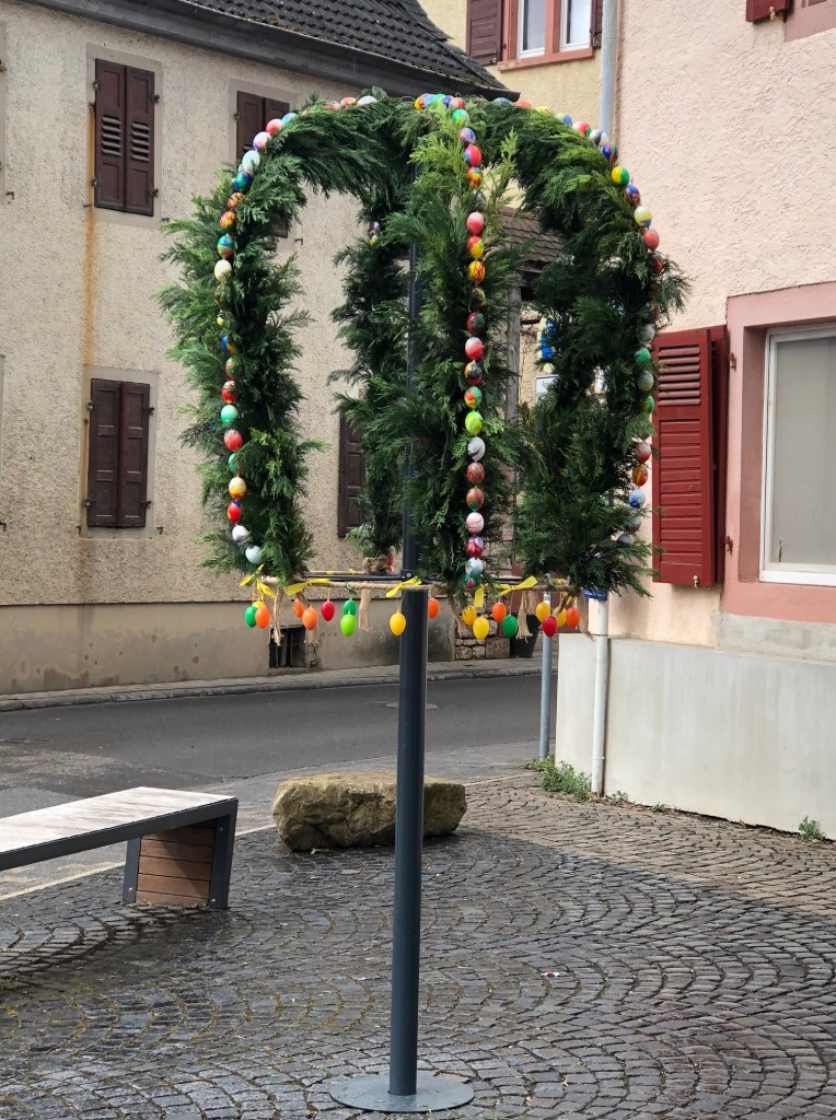 Viele fleißige Hände haben dafür gesorgt, dass die Osterkrone rechtzeitig fertig wurde. Ein besonderer Dank geht auch an die Kinder der Kita Dexheim, die die Eier so schön bunt angemalt haben, und auch an eine engagierte Kita-Mutter, die den Kontakt hergestellt hat!