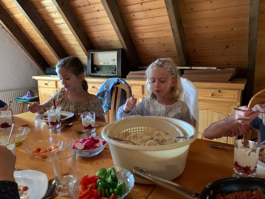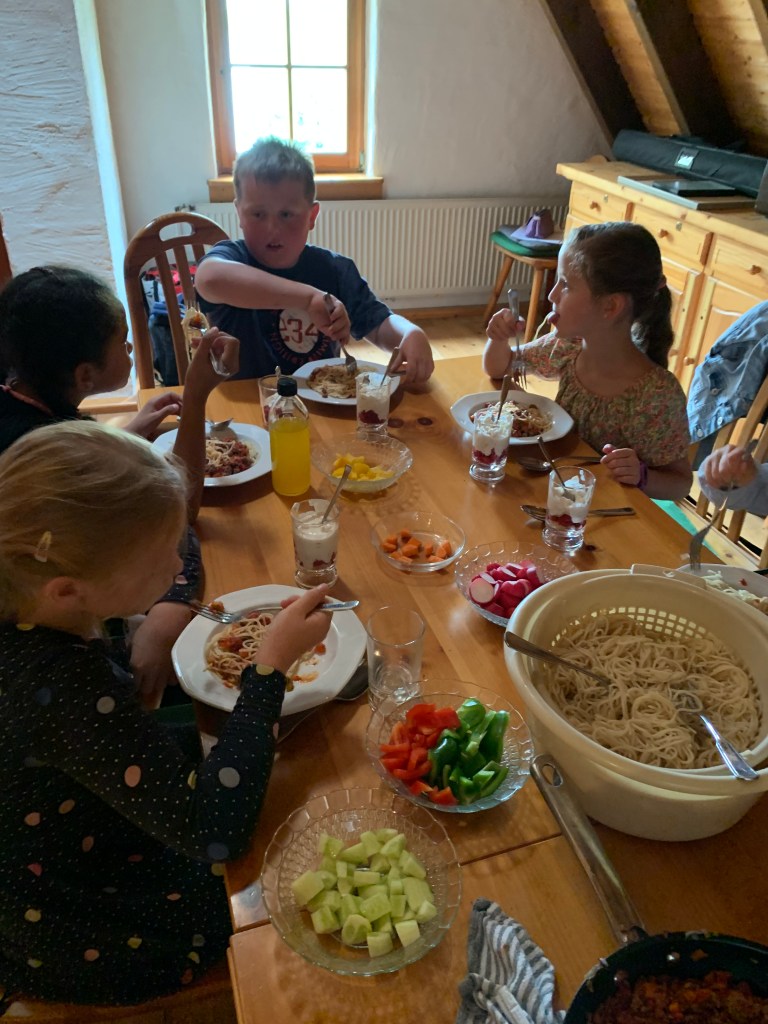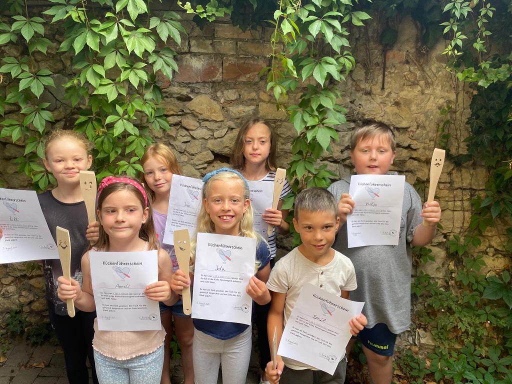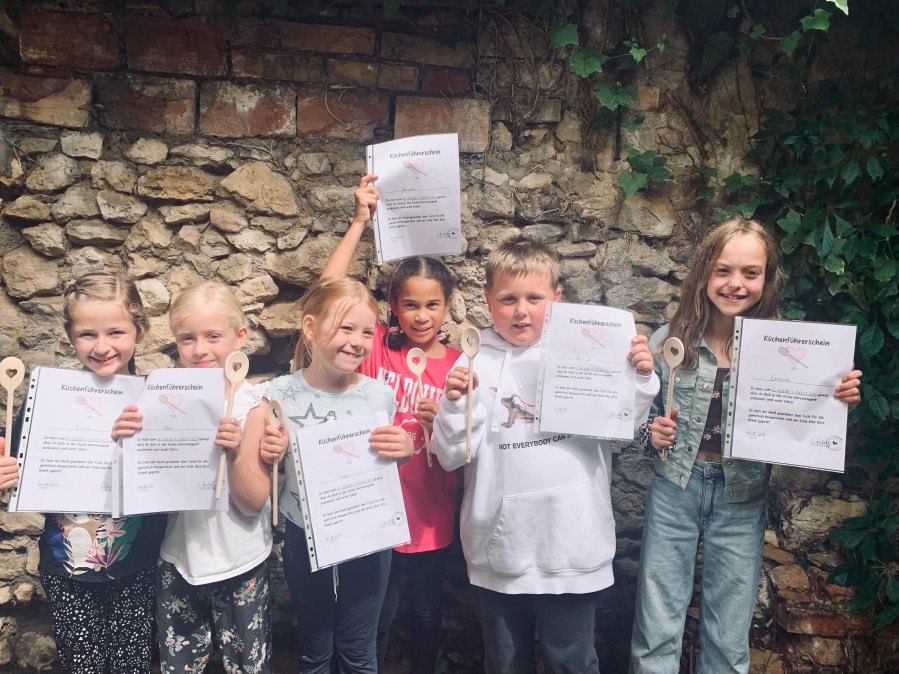 Das Backhaus war wieder gefüllt von leckeren Gerüchen, guter Laune und viel Gelächter. „Wir sind alle Dorfkinder“ wurde lauthals mitgesungen, während die Töpfe klapperten und das Gemüse geschnitten wurde. Vom Kartoffelpuffer aus Omas Zeiten, mit selbstgemachtem Apfelmus, bis zum Fusion Burger war alles dabei und zum Abschluss gab es wieder eine Urkunde für die tolle Leistung.